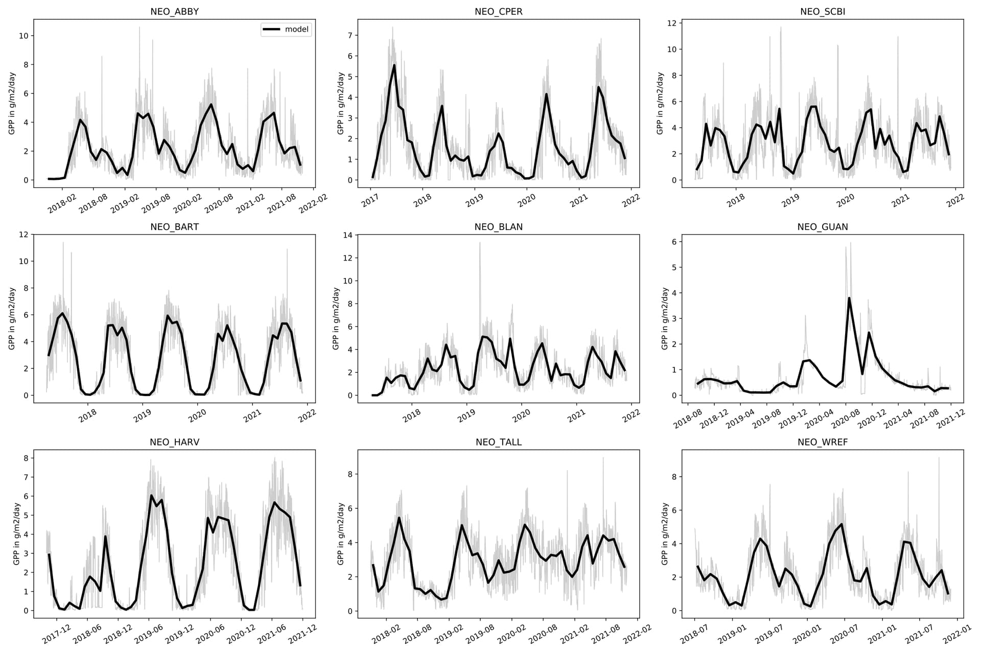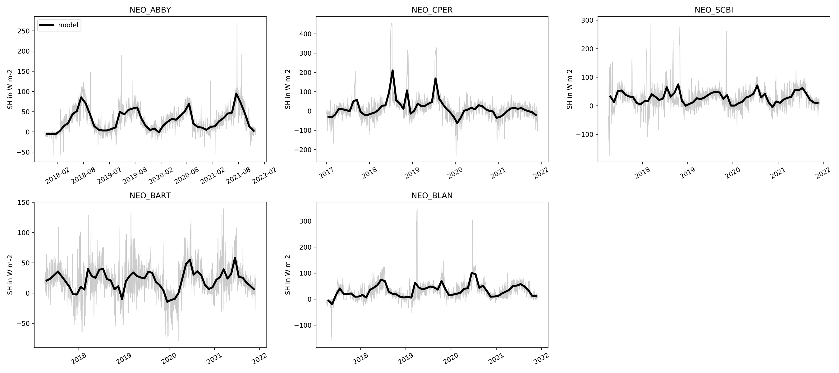 I am attaching the plots I made of the model output data for all 9 of the NEON sites with the u-al752 suite, including for these 4 NEON terrestrial-core forest sites. These plots do not have the observed NEON data overlain, as we discussed by email. I will try to work on overlaying the observed NEON data next. This will be a fair amount of work to do. I will try to get this done before the AGU. The thick black lines in the plots are the monthly average of the model, whereas the thin gray lines are the daily average of the model. The site “GUAN” site doesn’t seem to have an annual cycle – or the inter-annual variability overrides this annual cycle – or there is some mistake that I made. As discussed before, the sites “ABBY” and “BLAN” possibly have some spinup problems or something, since their initial values in the main run are rather low or flatline for some of the output variables.