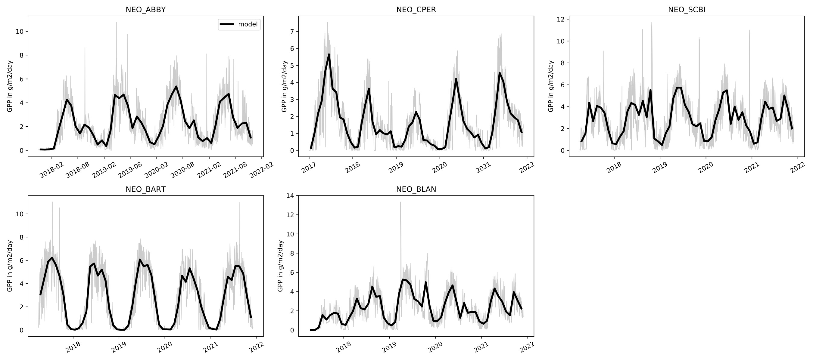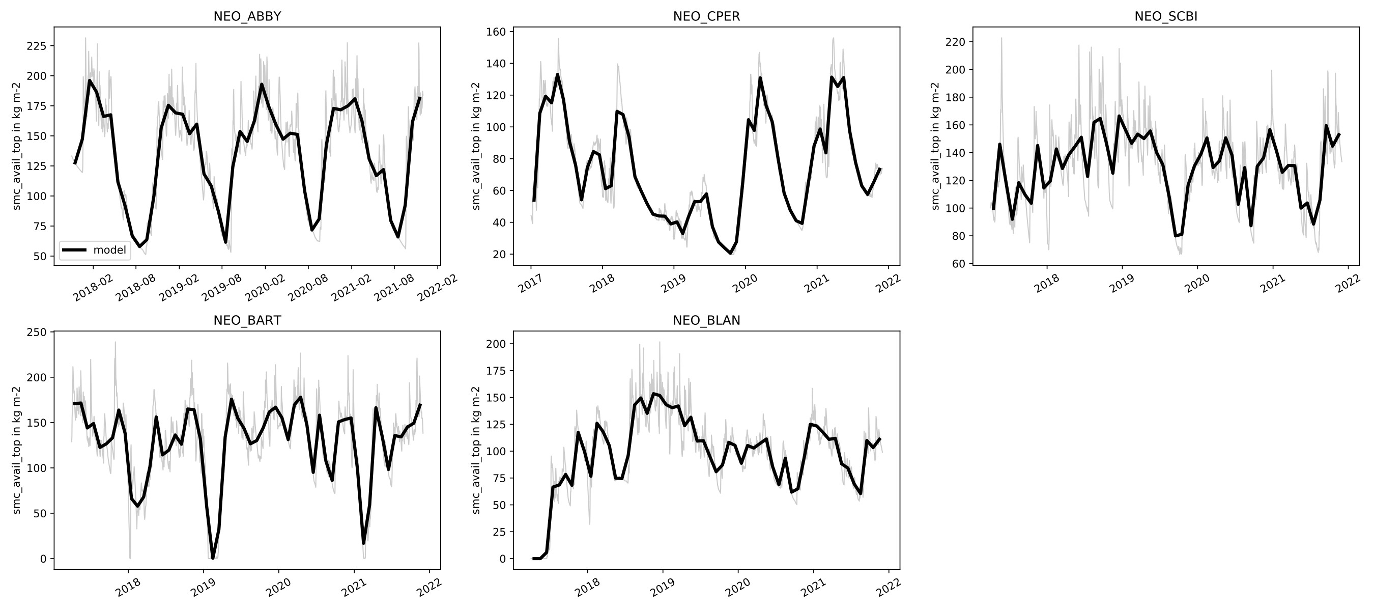 I am attaching the plots I made of the model output data for these 5 NEON sites with the u-al752 suite. These plots do not have the observed NEON data overlain. I will try to work on overlaying the observed NEON data next. This will be a fair amount of work to do. The thick black lines in the plots are the monthly average of the model, whereas the thin gray lines are the daily average of the model. The sites “ABBY” and “BLAN” possibly have some spinup problems or something, since their initial values in the main run are rather low or flatline for some of the output variables.